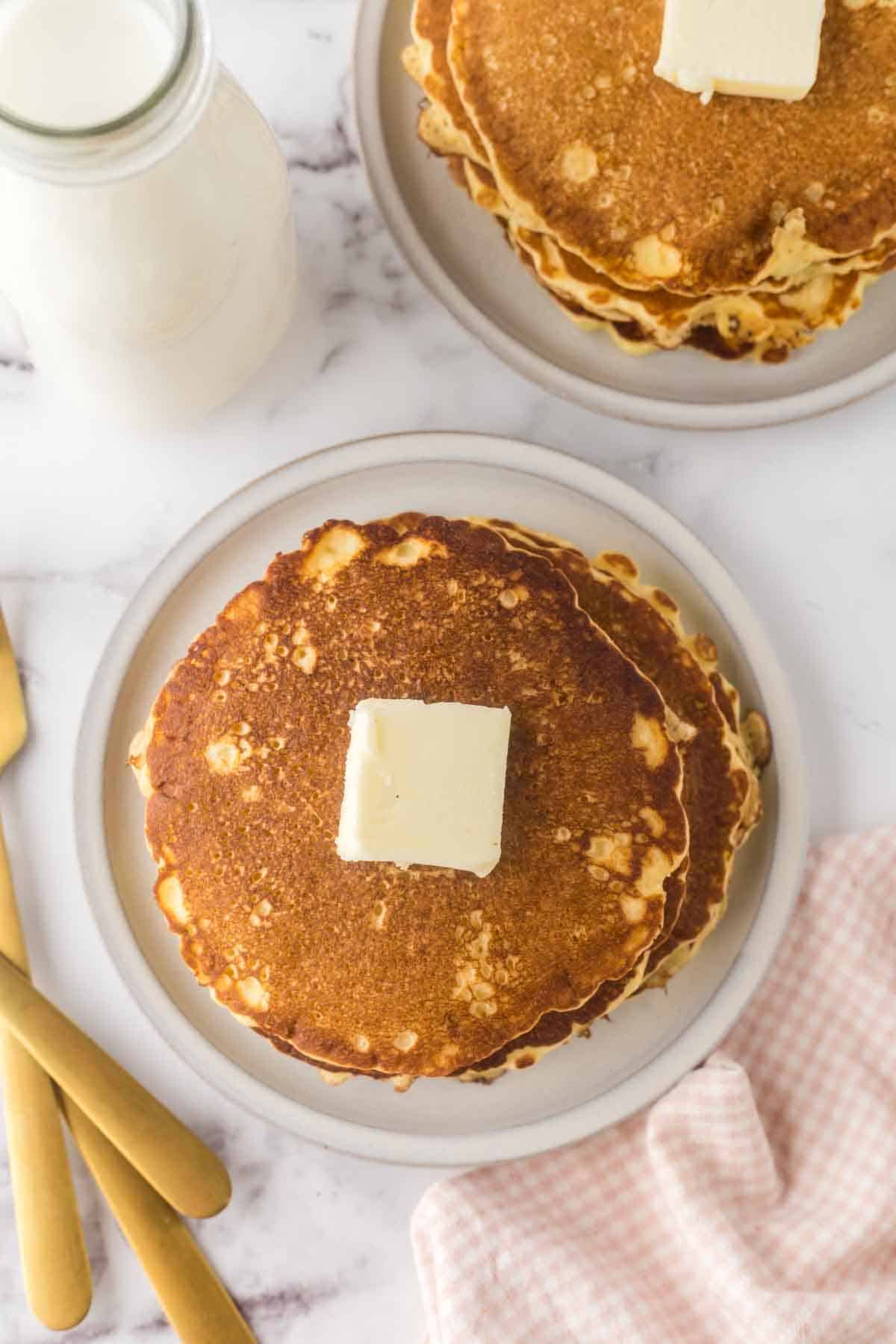One of my favorite things about these buttermilk pancakes is that they freeze really well! I allow the pancakes to cool slightly before I stack a few inside of a Ziplock bag and store them in the freezer for up to 3 months. You can warm your leftover pancakes from frozen or allow them to thaw in the fridge overnight. When I’m ready to enjoy these buttermilk pancakes again, I’ll toss them in the microwave for 40 seconds or until warmed through. They make for a quick breakfast or fun after-school snack.