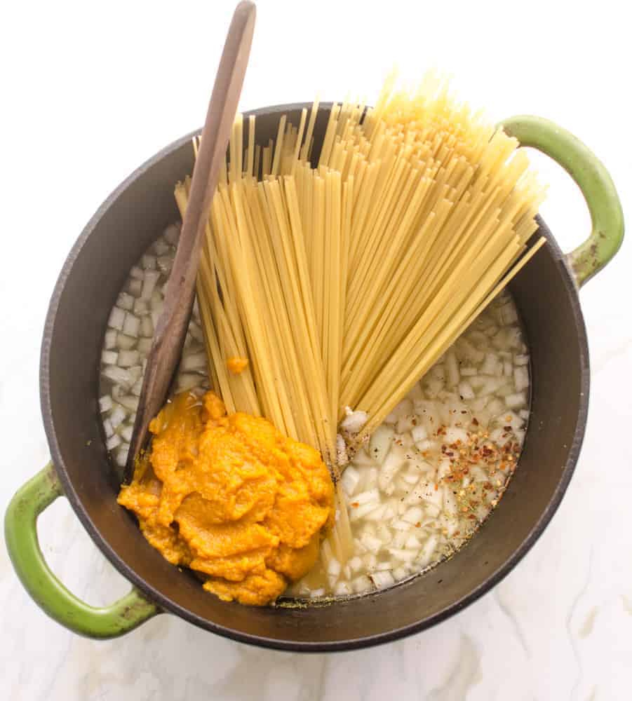 One pot creamy pumpkin pasta with toasted walnuts and parsley is a simple meatless meal the whole family will love. Plus, it’s done in 20 minutes!