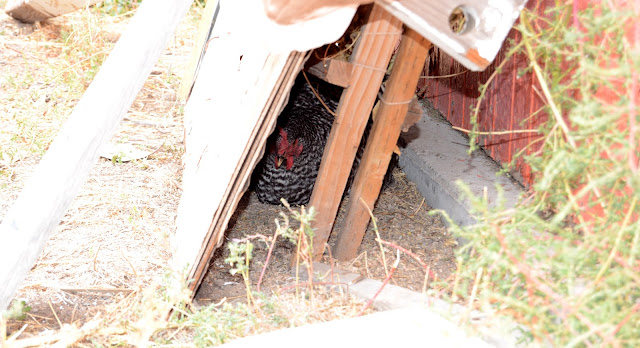 It’s hard to tell, but that is a hen hiding under the board laying an egg.