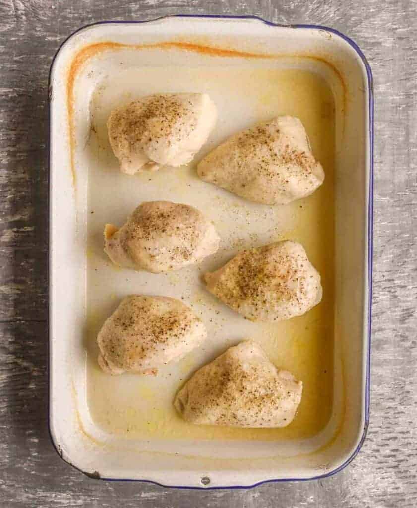 - Place the chicken in a baking dish and brush with melted butter or oil on both sides.