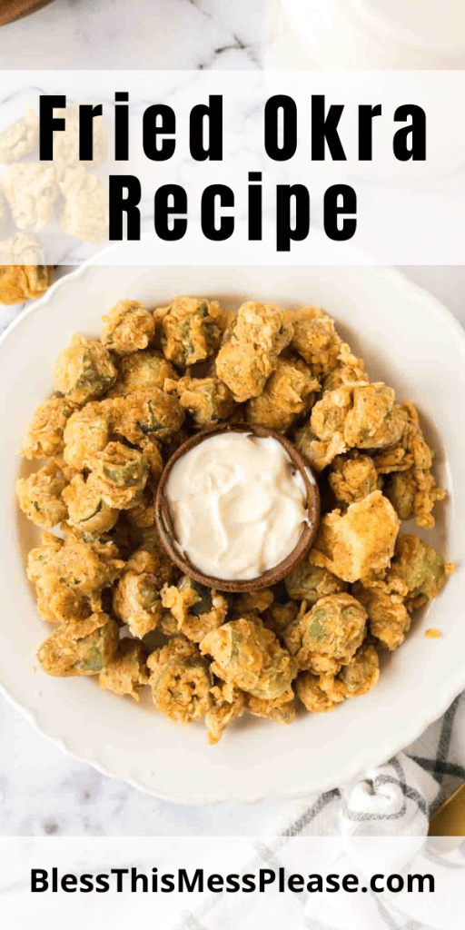 small white plate with a ring of fried okra around a dish of aioli