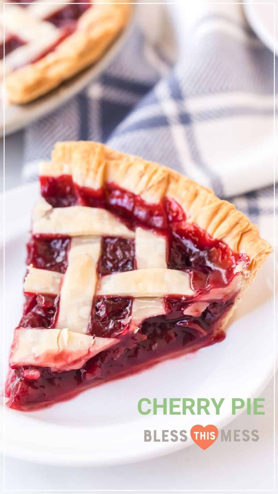 My favorite type of cherry to use for pie is canned, pitted red tart cherries. You could also use frozen tart cherries or frozen sweet cherries. See the notes at the bottom of the recipe card for how to adjust the baking ratios if you use either of those.
