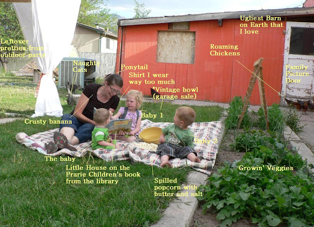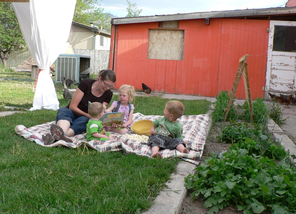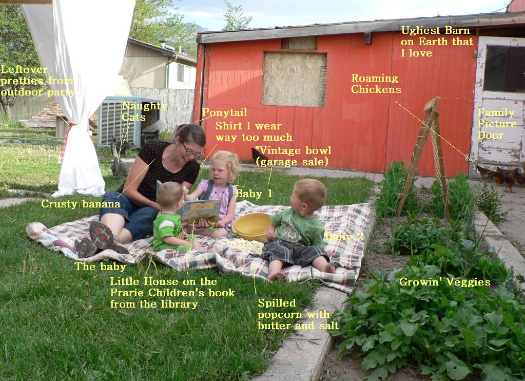 The options were endless. In the end I gathered my favorite things outside where I am the happiest. This is who I am and how I want my kids to think of me. I want them to remember sitting on a quilt, warm buttered popcorn (and not that microwave kind either) smells filling the air, animals running around, and their momma reading the most recent library finds to them. I love how typical this picture turned out; it’s real and I like that.