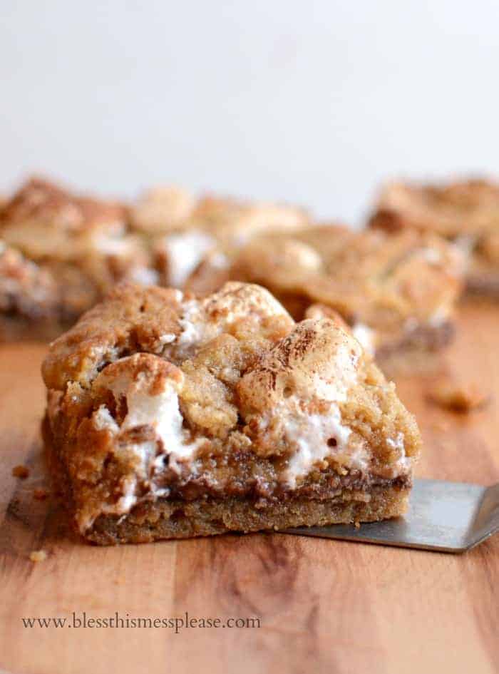 We love using the fluff because it is easy to spread and ensures that you get the marshmallow taste in each bite. But, if you do not have marshmallow fluff, then marshmallows will give you the same taste and work just fine. I would recommend using mini marshmallows or chop them up if you have bigger ones. They should melt nicely while the bars bake, but it will have a slightly different texture than using the fluff, so keep that in mind.