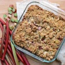 Rhubarb Crumb Bars have a buttery cake on the bottom, a layer of rhubarb in the middle, and it’s all topped with a perfectly sweet crunchy crumb.