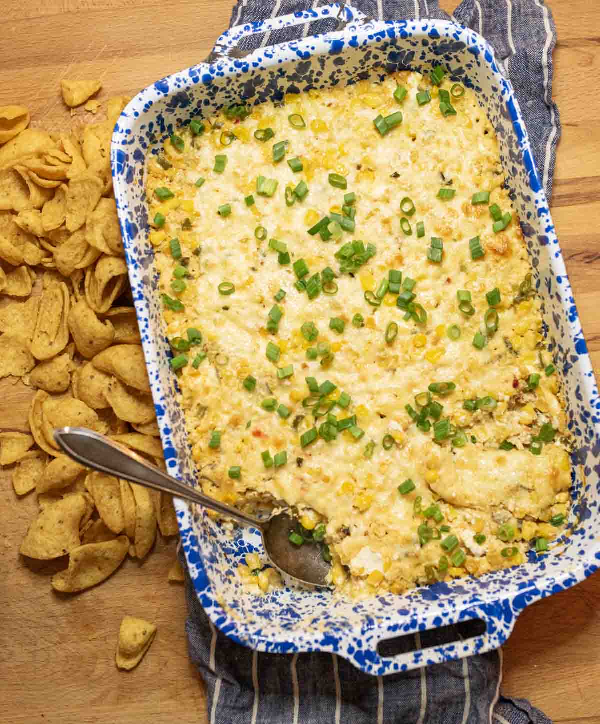 - Remove from the oven and let it cool for about 5 minutes to set slightly. Sprinkle the diced green onions over the top and serve warm with tortilla chips or Frito scoops.