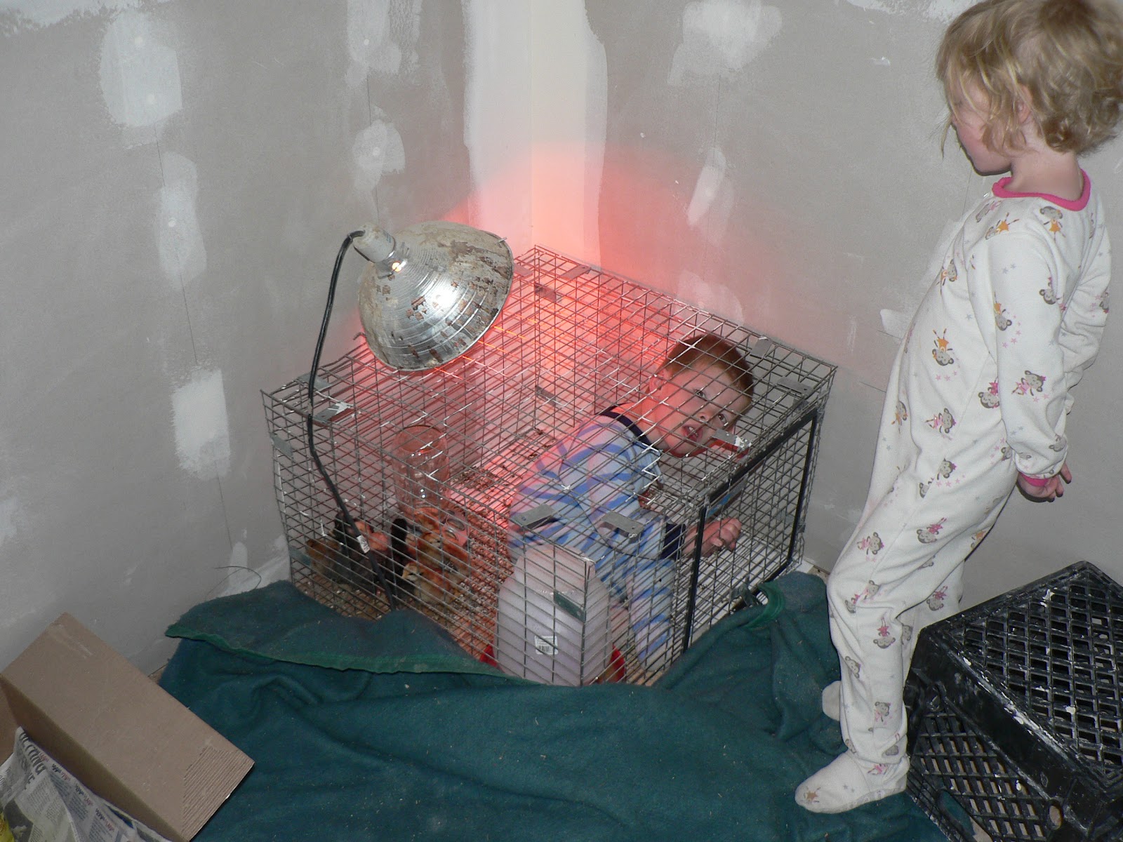The other morning I was feeding the baby while the older kids were in the other side of the house “looking at the chicks.” The kids were being good but the chicks were making a lot of noise. I finally when in to check on them and was surprised by what I found. The biggest chick ever! He was so sad when he had to get out. He was “just pettin’ dim”.