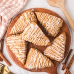 Make your glaze by whisking together the powdered sugar and maple syrup. Drizzle the glaze over your scones right before serving them. Enjoy!